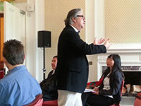 A delightful encounter with Prof. Gordon Melton after the speech 伍教授发表和谐神学后,美国宗教研究专家Gordon Melton教授提出发问,并十分欣赏伍教授用生动例子解释 |