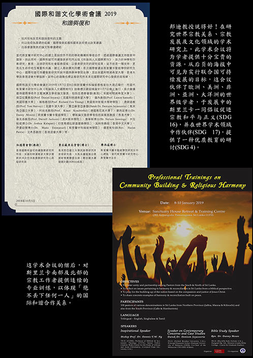 1/2019 International Harmony Conference, Sri Lanka 斯里兰卡之国际和谐文化学术会议 Photo-taking with renowned international scholars, guests and over 100 local community leaders and church leaders during the opening ceremony. 於開幕式上與各來賓、國際著名神學家及學者並參與 之一百多位當地教會領袖合照 |