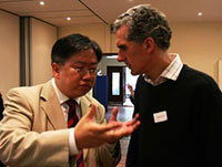A delightful encounter with Prof. Gordon Melton after the speech 伍教授发表和谐神学后,美国宗教研究专家Gordon Melton教授提出发问,并十分欣赏伍教授用生动例子解释 |