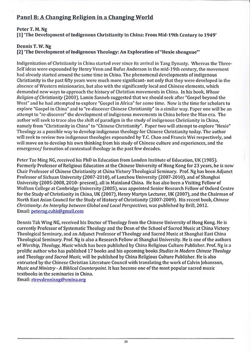 Inaugural Speech by Bishop Prof. Dennis T.W. Ng〔伍德荣会督(教授)〕 "The Contribution of Theology of Harmony in China to World Harmony" |